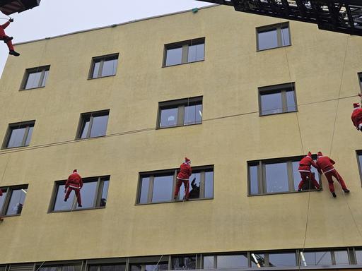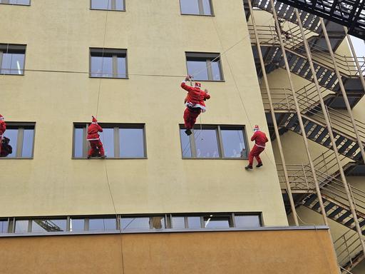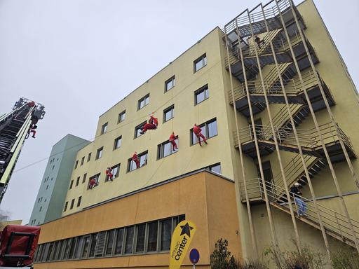 Jamarski reševalci, preoblečeni v Božičke, so danes s tradicionalnim spustom z vrha stavbe mariborske klinike za pediatrijo razveselili mlade bolnike, ki se zdravijo v bolnišnici. "Epidemija gripe je na pohodu, bolnišnice so polne, a otrokom so Božički nedvomno pričarali lepo doživetje," je povedal predstojnik klinike Jernej Dolinšek.