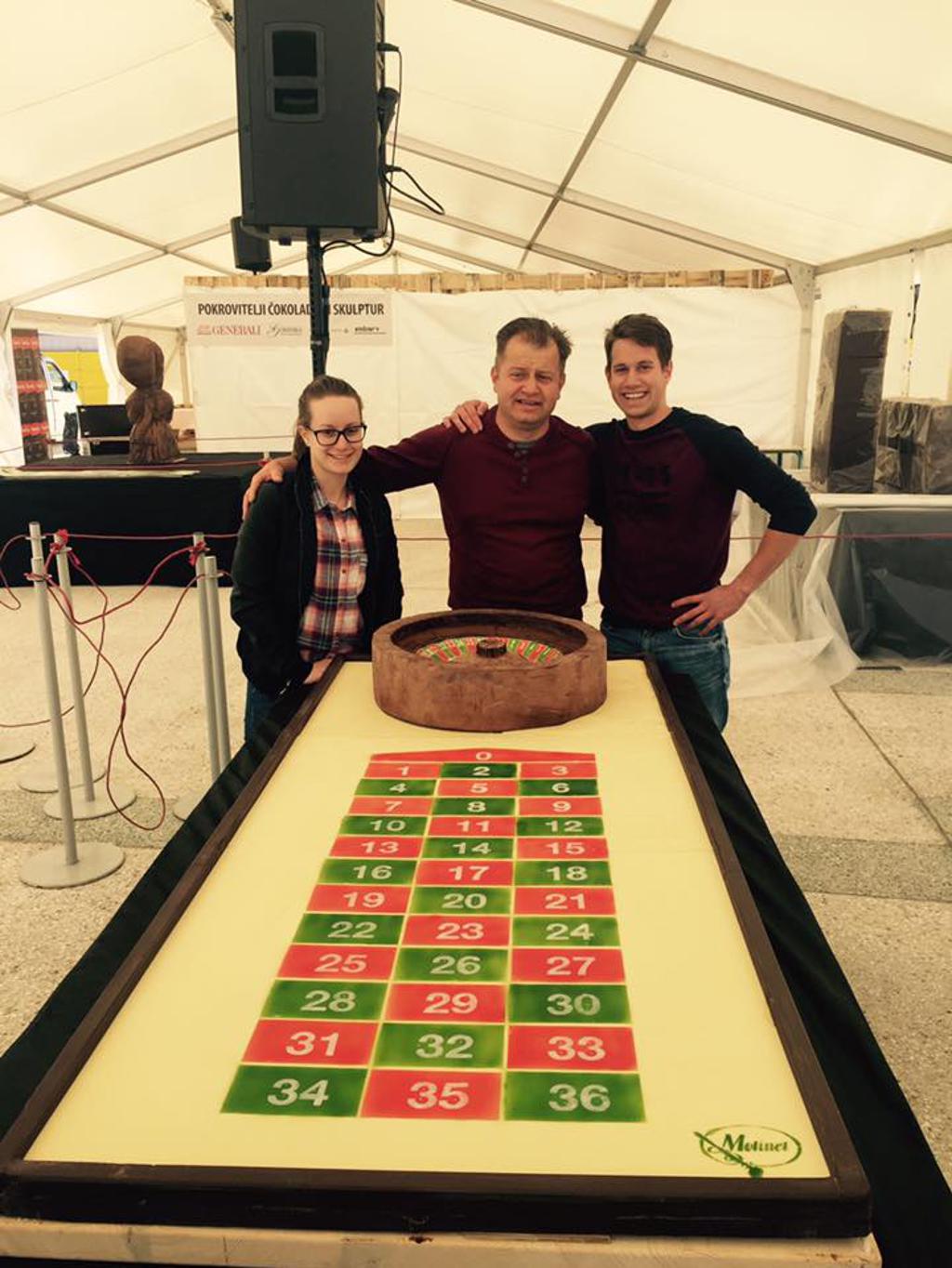 Poleg elank so istega leta na festivalu navdušili s čokoladno ruleto, za katero so porabili kar 150 kilogramov čokolade. Pri obeh čokoladnih umetninah velikankah je očetu pomagal naš sogovornik.
