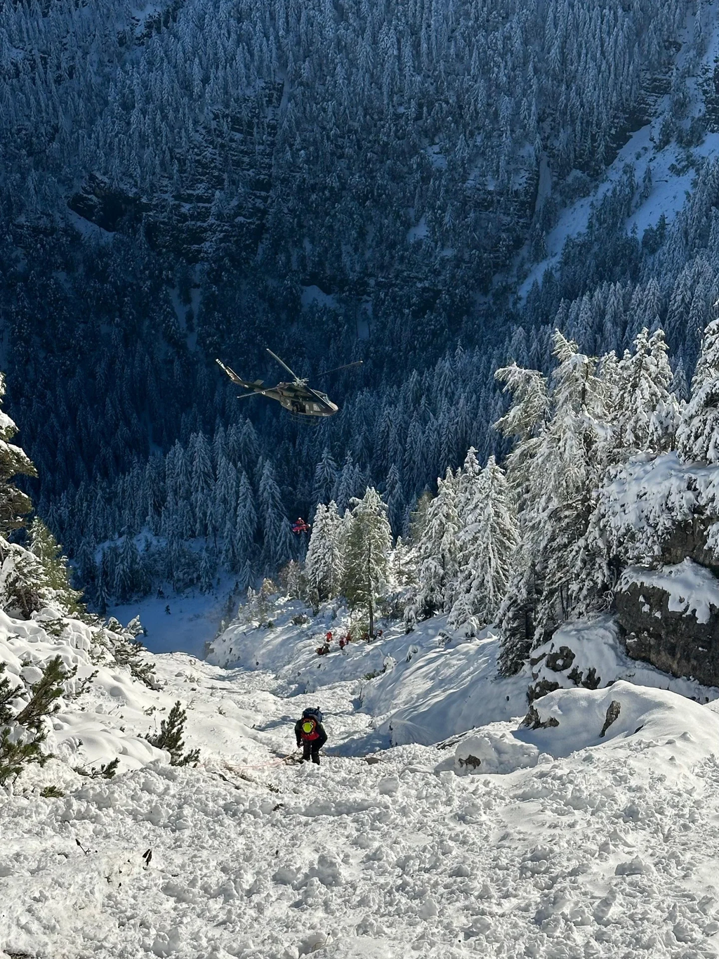 Danes so z reševanjem nadaljevali navsezgodaj. Helikopter jih je pripeljal na vznožje grape.