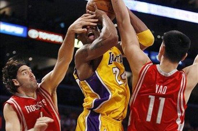 Navijači LA Lakers so bili pred prvo tekmo drugega kroga končnice v precejšnji negotovosti glede nastopa prvega zvezdnika moštva. Kobe Bryant se je kljub zdravstvenim težavam vseeno soočil s tekmeci iz Teksasa, bil znova nadvse dejaven (proti košu tekmeca je iz igre sprožil kar 31 žog), dosegel 32 točk, a kaj ko je na drugi strani stala izjemno homogena in razpoložena zasedba Houston Rockets. V slednji so kitajski velikan Yao Ming, Argentinec Luis Scola in Ron Artest povsem razorožili podprvake. Tekmo pa so zaznamovali tudi številni udarci. Ming je tokrat na parketu skupil udarec in se je držeč za koleno odšepal z igrišča za kratek čas po bližnjem srečanju z nasprotnikom Bryantom. Shane Battier je z igrišče odšel okrvavljen, ko mu je slovenski reprezentant Vujačić pri poskusu blokade prebil arkado nad očesom. Igralcu Houstona so rano morali oskrbeti s štirimi šivi. Vujačič je sicer v skoraj 14 minutah, kolikor je bil pod koši, v statistiko tekme vpisal dve točki, asistenco, skok in ukradeno žogo.