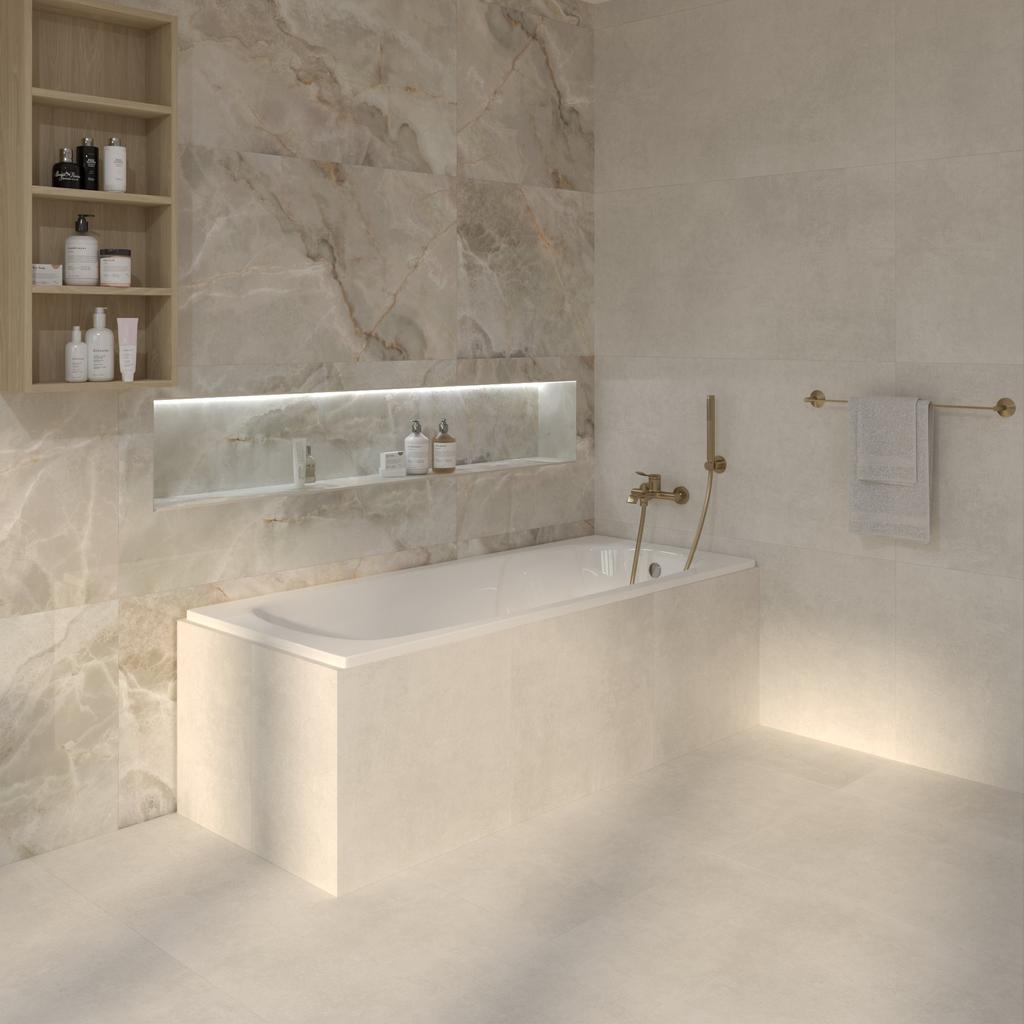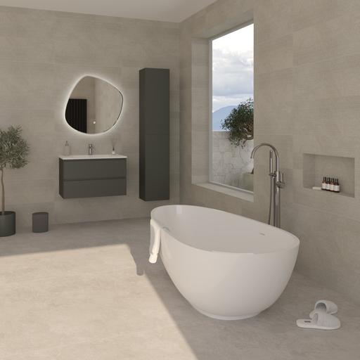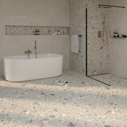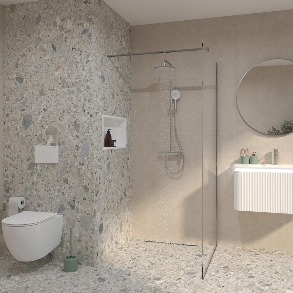 Letos je poseben poudarek na naravnem videzu, s ploščicami, ki posnemajo kamen, beton ali les, ter na nežnih, brezčasnih odtenkih, kot so peščena, siva in bež. Takšne ploščice vizualno povečajo prostor in ustvarijo občutek umirjenosti, zlasti v kombinaciji z visečim pohištvom, čistimi linijami in mat površinami.