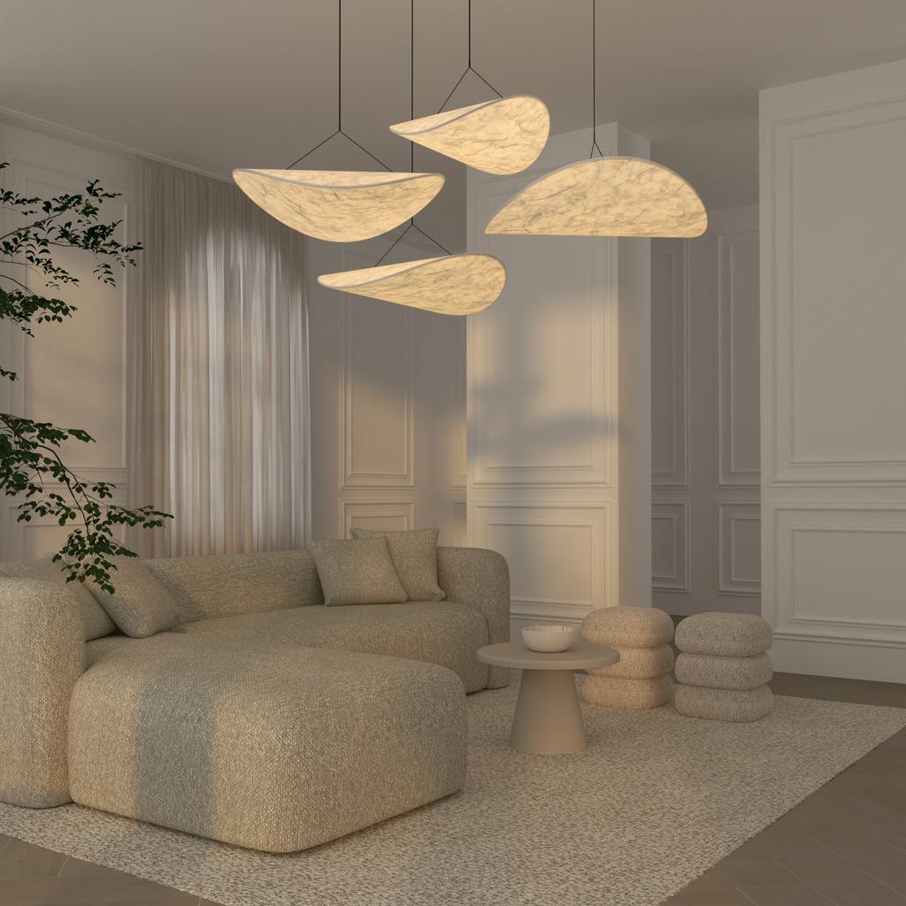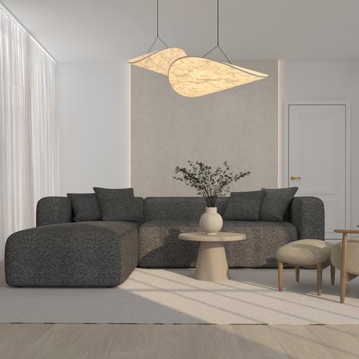 Izdelki: trosed korra Liris, fotelj korra Liris, otomanski stol korra Liris, viseča svetilka Zorra Lighting Recens, klubska mizica korra Donna.