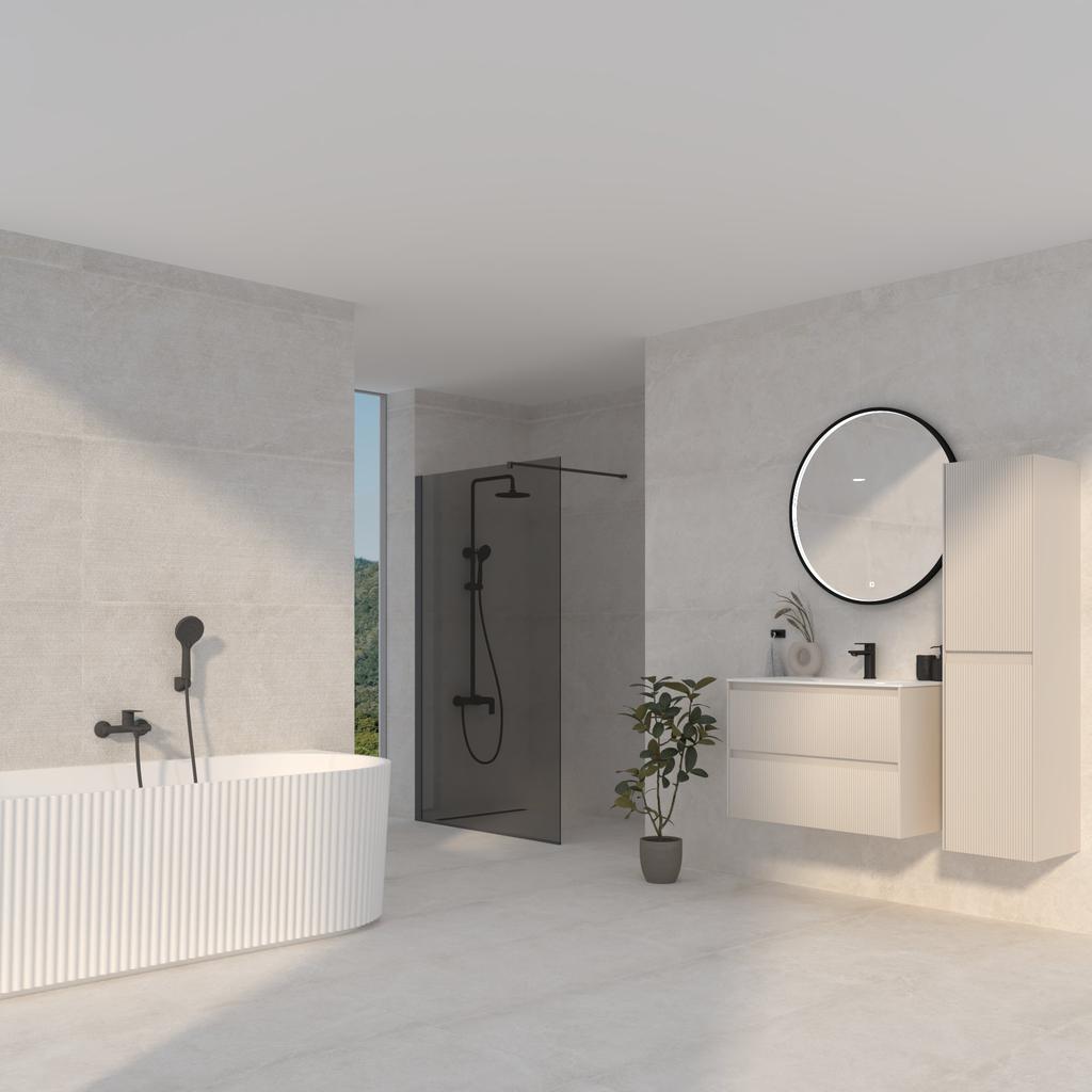 Izdelki: kopalniška baza Concepto+ Marta Black, kopalniška omarica Concepto+ Marta Black, umivalnik Concepto Bell, ogledalo Concepto+ Vittoria Touch, ploščica May Ceramics Cementino Blast White, straniščna školjka Concepto Eva Black Rimless, armatura za umivalnik Voxort Dahlia.