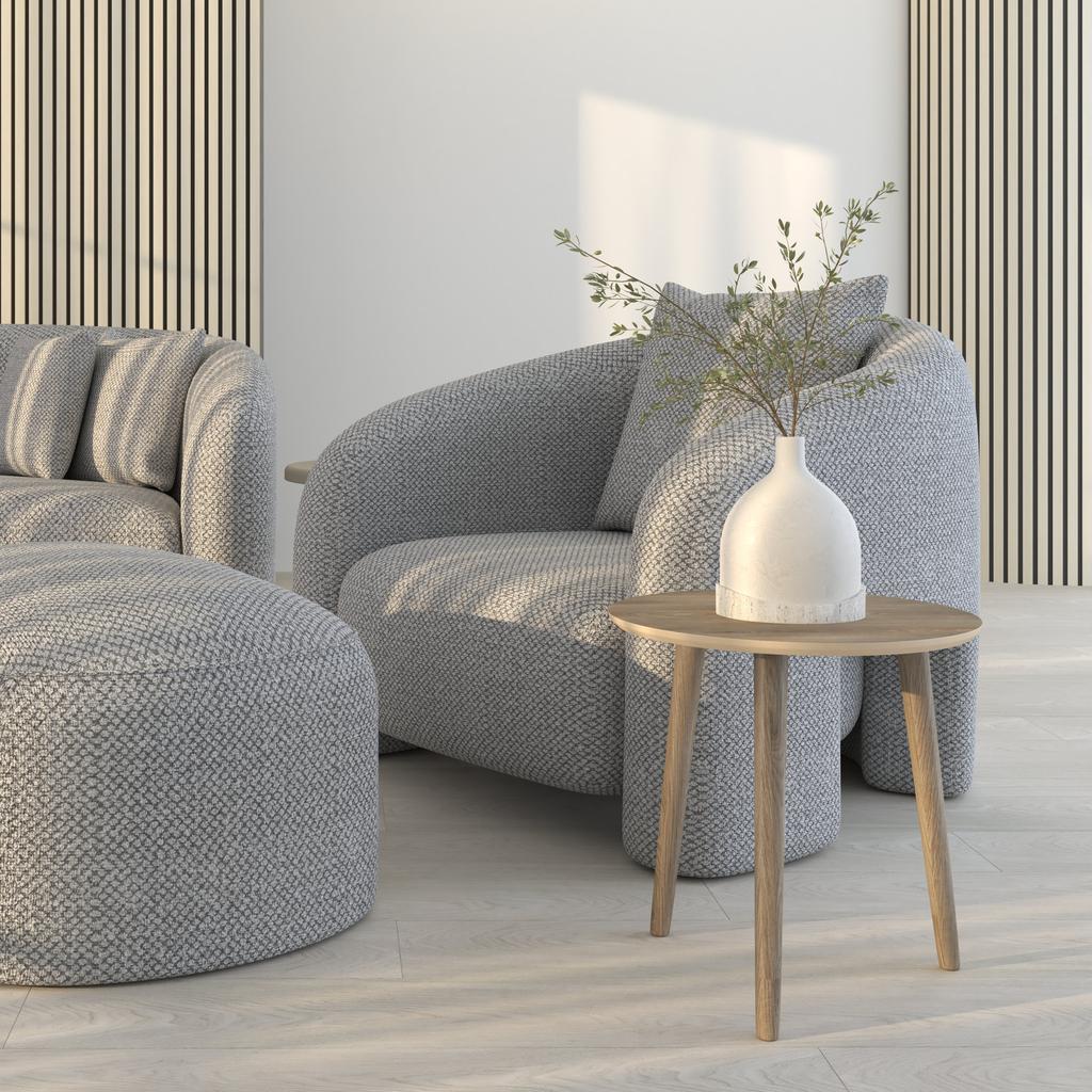Izdelki: fotelj korra Magali Dark, tabure korra Magali Dark, kotna garnitura korra Magali, stenski akustični panel Voxort Zara Walnut, viseča svetilka Zorra Lighting Venus, klubska mizica korra Donna.