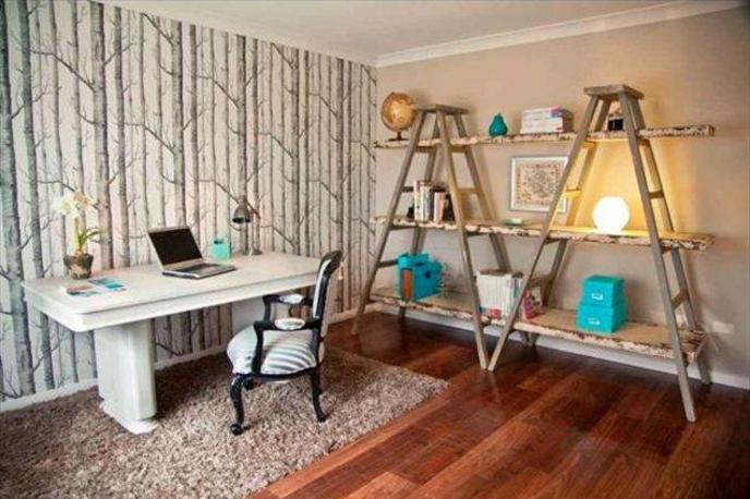 Vse, kar potrebujete, je torej lestev oziroma najbolje je, če imate dve, in vsaj tri deske, ki jih boste namestili na lestev. Pred namestitvijo jih lahko oblečete v tapete ali pa prebarvate. Prav tako lahko olepšate videz lestev in jih barvno uskladite s preostalimi barvami v stanovanju.
