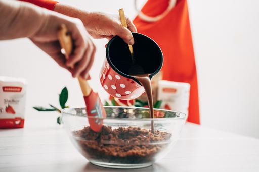 Vse sestavine damo v manjšo kozico in segrevamo na zmernem ognju, da se čokolada in maslo stopita. Ves čas mešamo, da dobimo gladko teksturo.