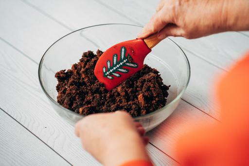 Ohlajen biskvit nadrobimo v večjo posodo in ga prelijemo s toplim čokoladnim prelivom. Dobro premešamo, da nastane kompaktna, oblikovalna masa.