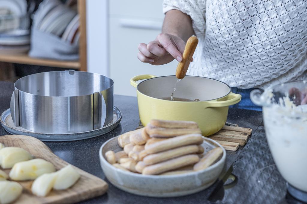 V jesenski različici klasična kombinacija kave in kakava naredi prostor toplim, sladkim in sadnim okusom. Namesto kave piškote tokrat prepojimo z domačim hruškovim kompotom. Vse skupaj se plasti s kremo iz maskarponeje, ki ostaja osrčje tiramisuja. Mehka, rahla in ravno prav sladkana, da se okusi lepo prepletejo.