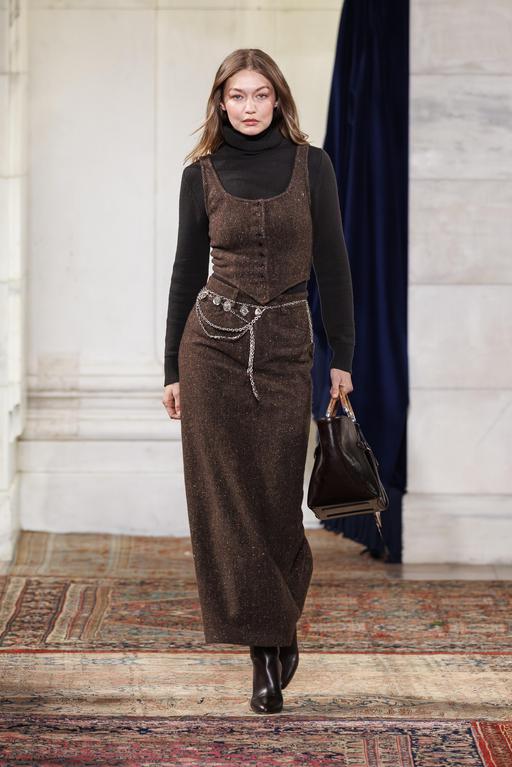 Modno revijo Ralph Lauren je otvorila slavna manekenka Gigi Hadid, ki je s svojo pojavnostjo in stajlingom takoj postavila ton celotni kolekciji. Nosila je obleko iz žametnega materiala, ki je v kombinaciji s pasom ustvarila izjemno eleganten in strukturiran videz. Celoten stajling je bil vseboval tople rjave odtenke, ki so delovali brezčasno, prefinjeno in popolnoma v duhu modne hiše Ralph Lauren. Prav takšni kosi dokazujejo, da prava eleganca ne potrebuje pretiravanja, temveč premišljeno obliko, kakovosten material in predvsem jasno vizijo.