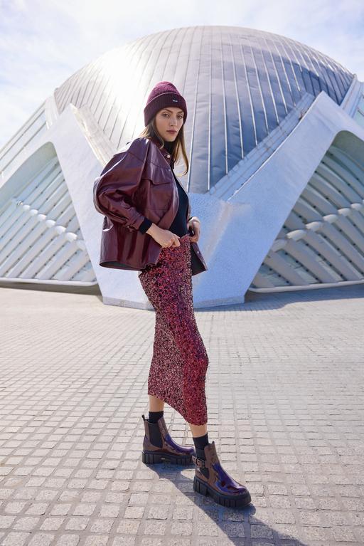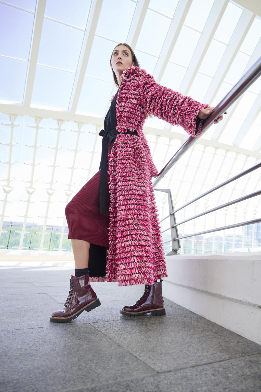 - Za eleganten videz: kombinirajte bordo škornje z antracitnim plaščem in pletenino.
