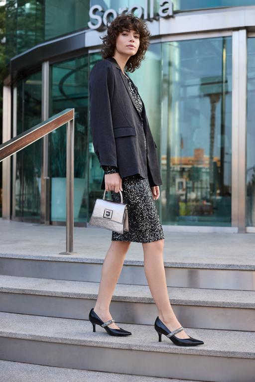 - Za začetnice v bleščicah: izberite torbico z metalnim leskom ali čevlje z bleščečimi detajli. Kombinirajte jih z osnovnimi kosi, kot so kavbojke, puli ali dolga volnena jakna.