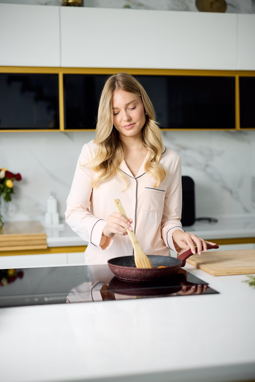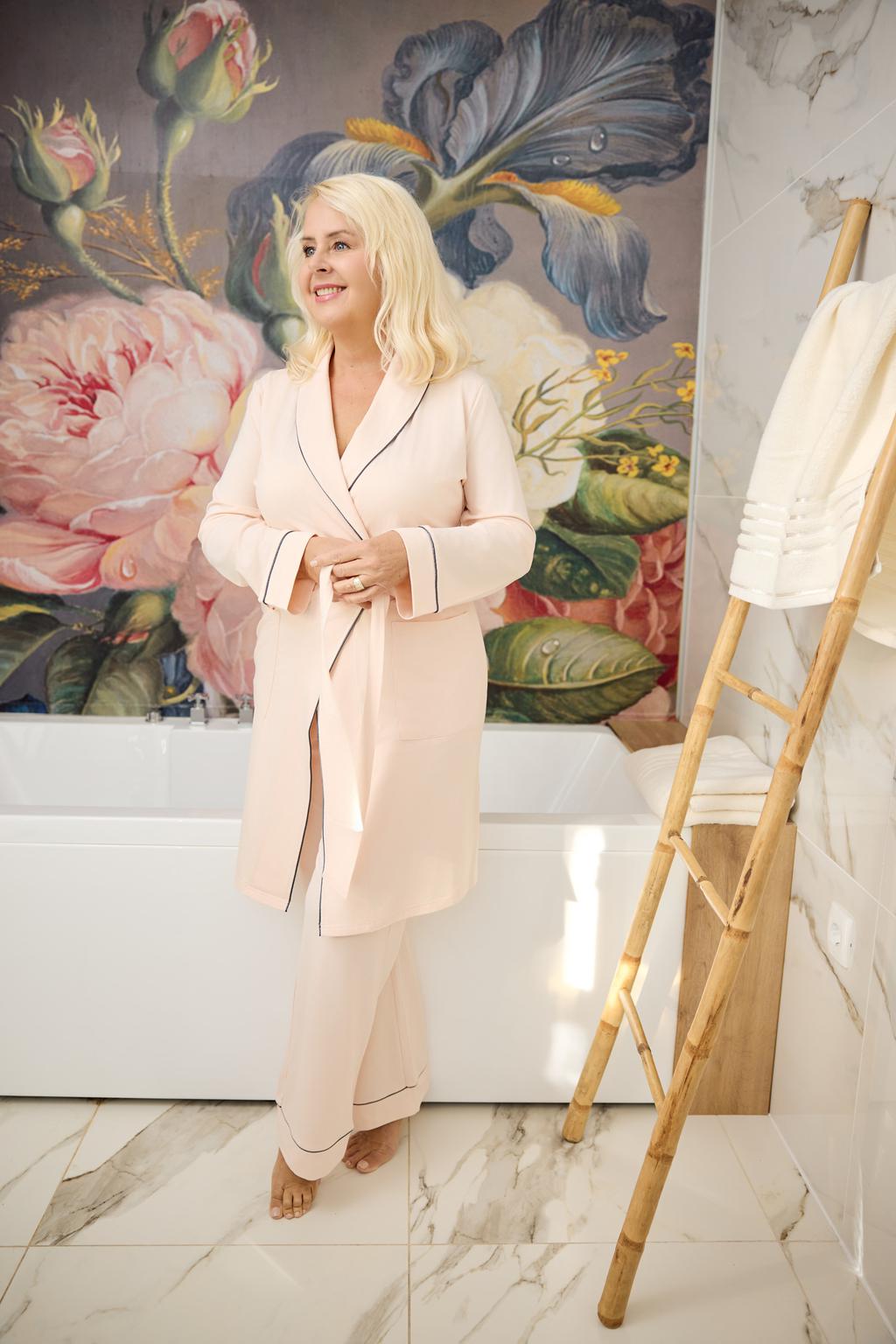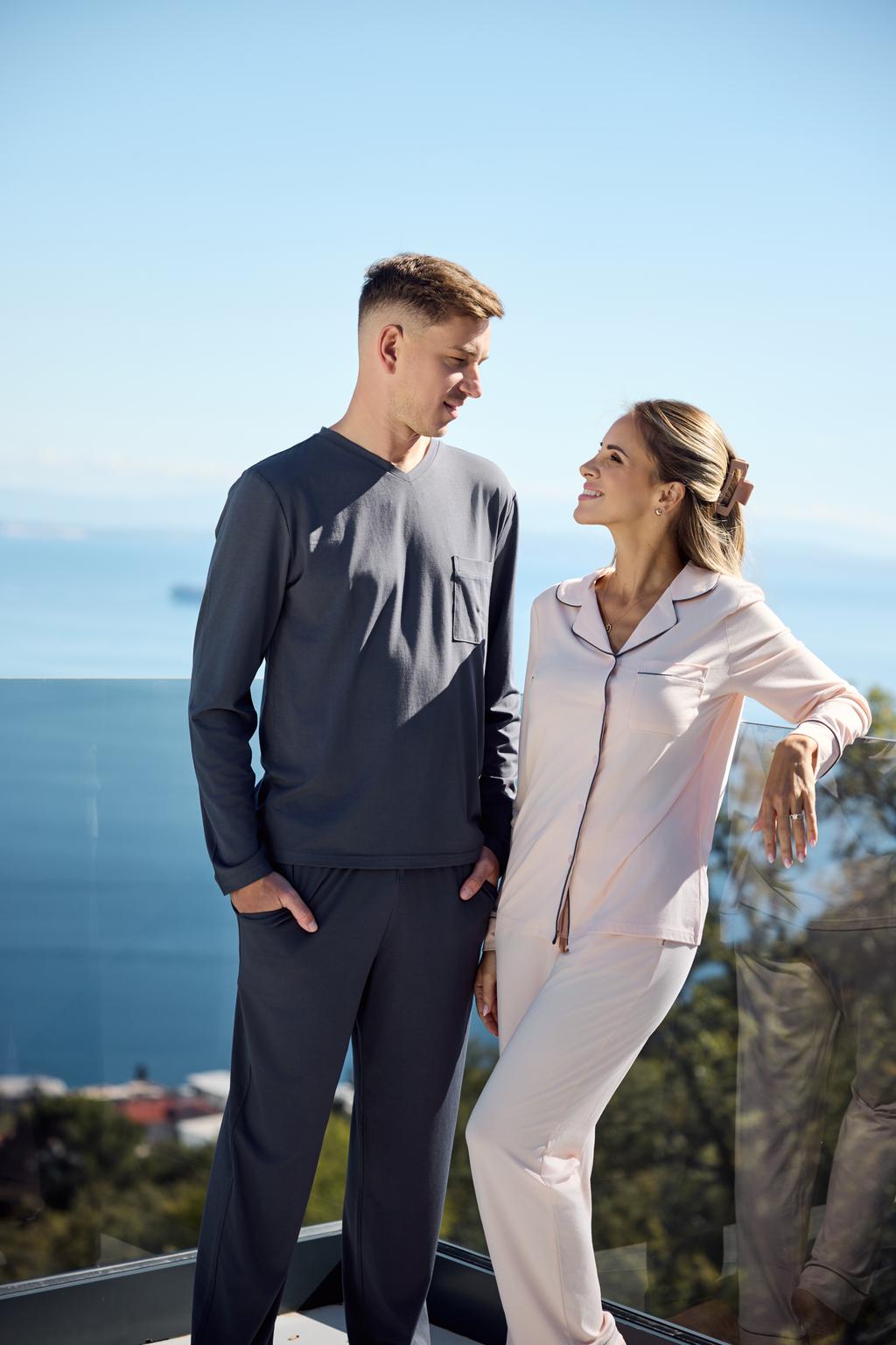 Za dodatno brezskrbnost je vsa linija izdelana v skladu s certifikatom OEKO-TEX® Standard 100, kar pomeni, da so tkanine brez škodljivih snovi in prijazne koži. Tukaj ni prostora za kompromise – niti pri materialih niti pri izdelavi. Več kot 80 let tekstilnega znanja se odraža v natančnem krojenju, lepo padajoči neprosojni tkanini, kontrastnih robovih, ki dodajo pridih elegance, ter detajlih, kot sta okrasni žep in diskretno zapenjanje z gumbi. To je brezčasen slog, ki deluje urejeno in prefinjeno, ne glede na to, ali pižamo nosite le doma ali jo podarite.