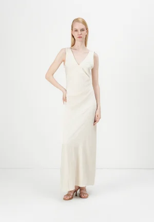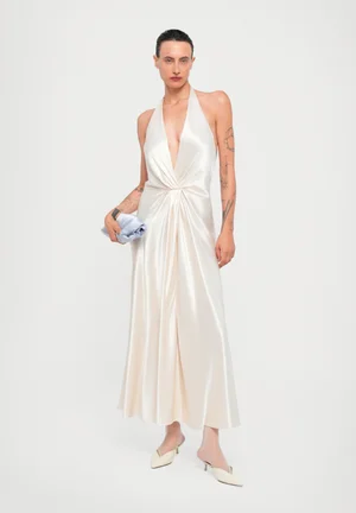 Glavni kos stajlinga je bila elegantna satenasta obleka v snežno beli barvi. Nina je izbrala obleko v prefinjenem kroju z rahlim padanjem in subtilnimi detajli, kot so nežni naborki. Tak kos je primeren za vsako praznično priložnost, saj združuje preprostost in eleganco.