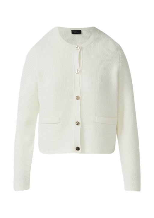 Da videz ne deluje preveč formalno, smo izbor dopolnili z jopico v slogu Chanel – kosom, ki vnaša lahkotnost, a hkrati ohranja prefinjeno eleganco. Jopica, izdelana iz kakovostne bombažne mešanice, navdušuje z nežno strukturo finega pletenja, ki zagotavlja udobje in brezhiben videz. Okrogel izrez in elegantno zapenjanje na gumbe ustvarjata klasično silhueto, okrasni žepi pa dodajo diskreten, a izrazit poudarek.