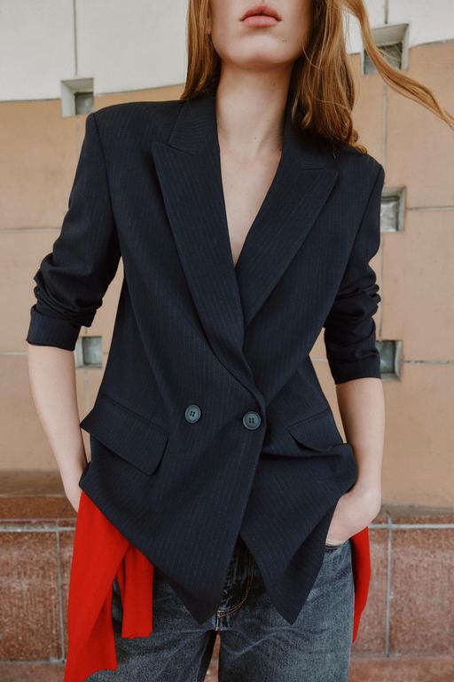 Izbrala je suknjič v temnomodri barvi z minimalističnim detajlom tankih črt, ki celoten videz lepo popestrijo. Strukturiran kroj definira zgornji del telesa in poskrbi za urejeno silhueto, hkrati pa ohranja brezčasno eleganco. Gre za kos, ki brez težav prehaja iz dnevnih obveznosti v bolj formalne priložnosti in ostaja aktualen ne glede na sezono.
